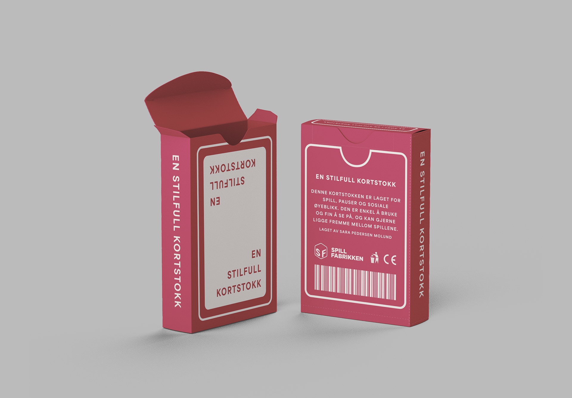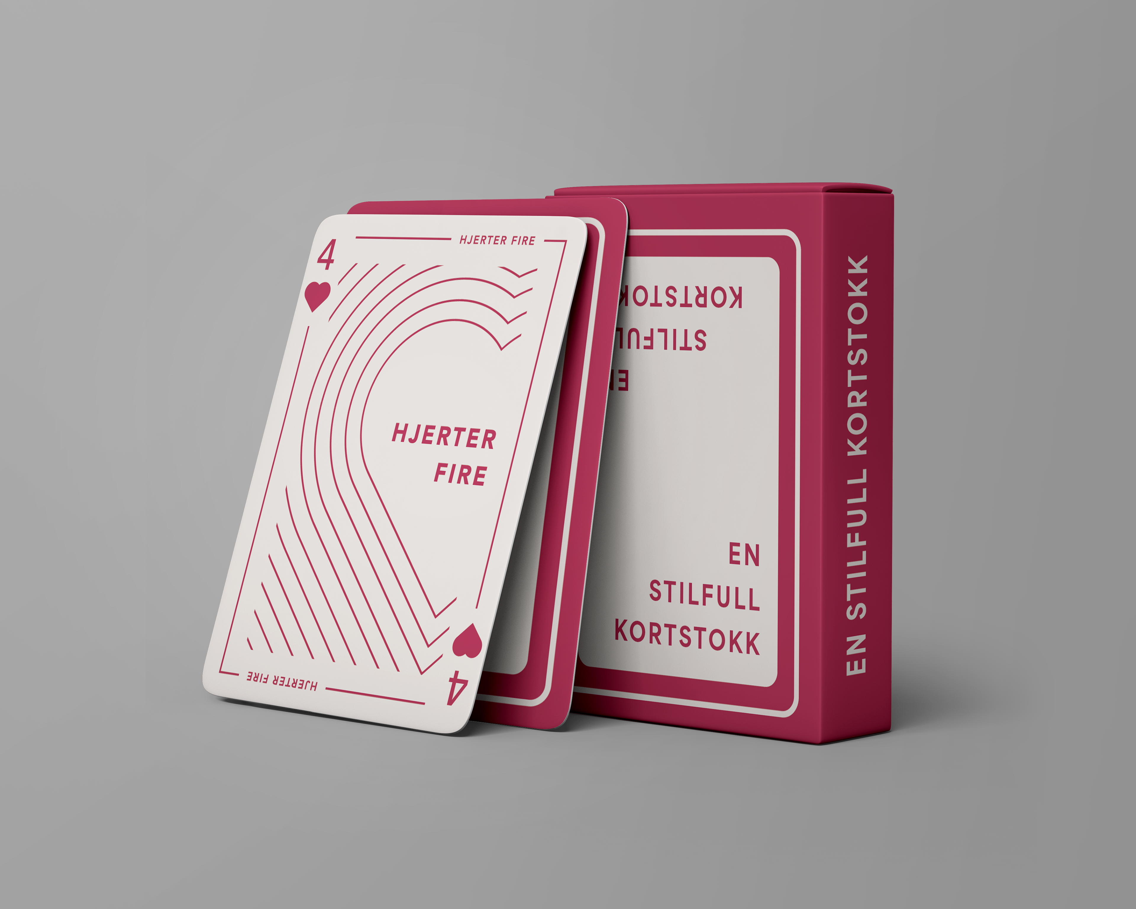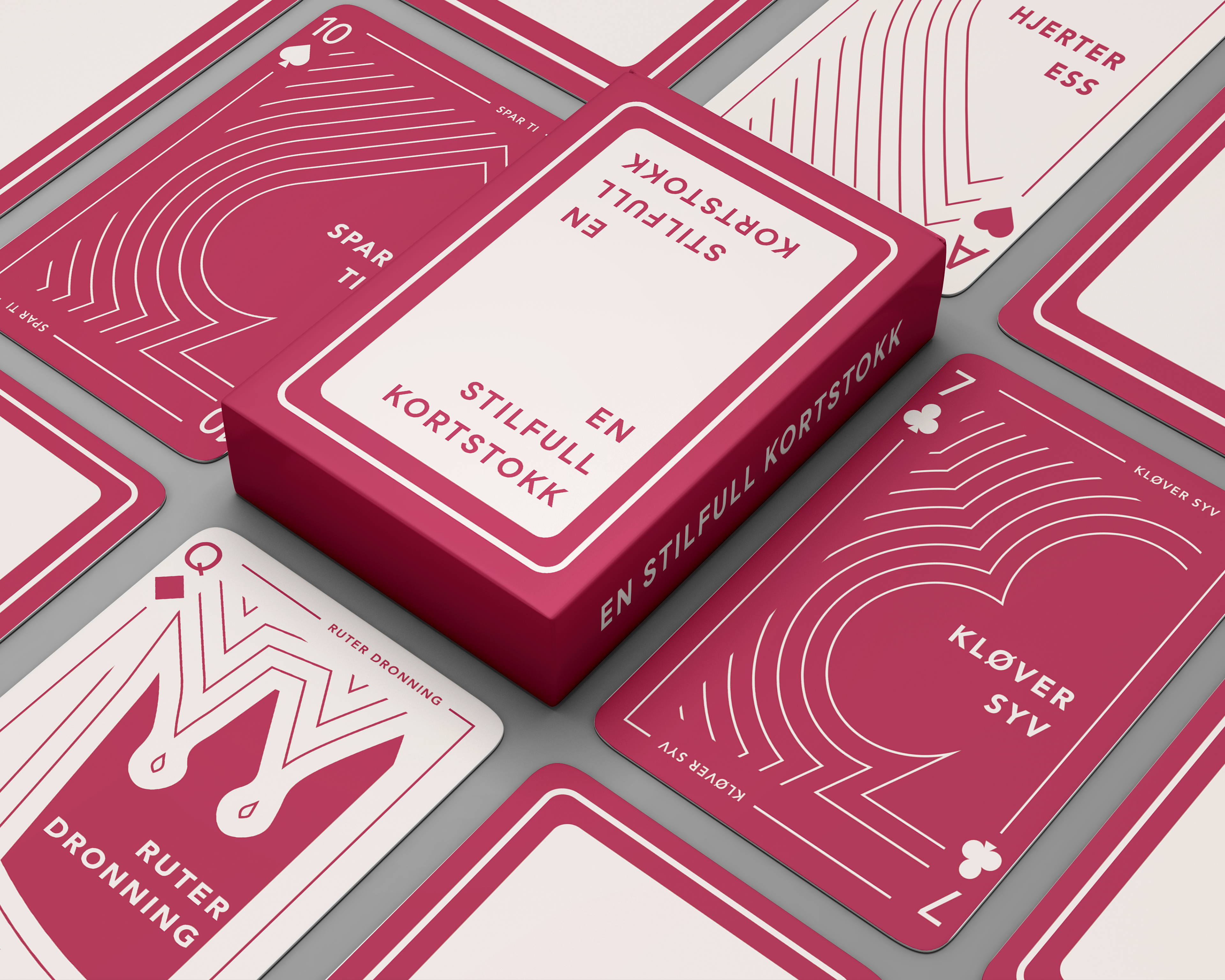 Ved å bruke et minimalistisk uttrykk, konsekvent typografi og enkle grafiske elementer, er tradisjonelle illustrasjoner erstattet med et mer moderne og stilrent uttrykk. Linjer er brukt som et virkemiddel for å skape rytme, sammenheng og gjenkjennelse på tvers av kortene, samtidig som symboler, tall og tekst er tydelig plassert for å sikre god lesbarhet og funksjon i spill. Fargevalget er bevisst og gjennomgående, og bidrar til å gi kortstokken en sterk identitet samtidig som den følger bransje-standarden for kontrast.